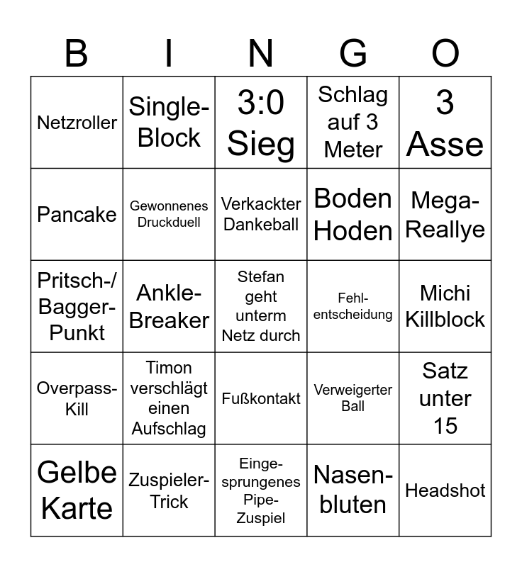 This bingo card has a free space and 24 words: Timon verschlägt einen Aufschlag, Zuspieler-Trick, Verkackter Dankeball, Gelbe Karte, 3 Asse, Netzroller, Pancake, Single-Block, Fehl- entscheidung, Fußkontakt, Boden Hoden, Pritsch-/ Bagger-Punkt, Verweigerter Ball, Satz unter 15, Gewonnenes Druckduell, Nasen-bluten, Michi Killblock, 3:0 Sieg, Mega-Reallye, Ankle-Breaker, Headshot, Overpass-Kill, Schlag auf 3 Meter and Einge-sprungenes Pipe-Zuspiel.