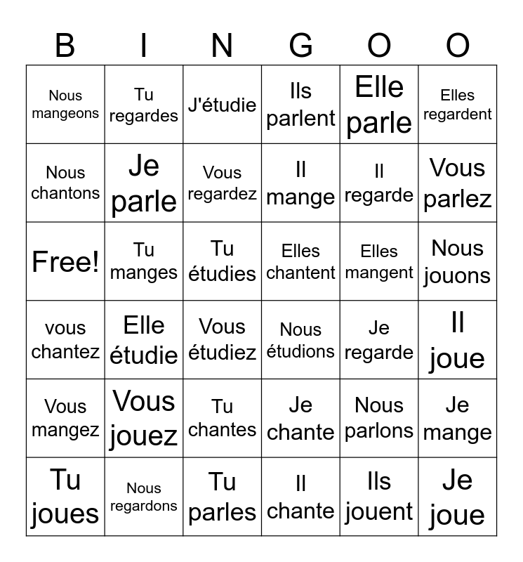 This bingo card has 36 words: Je chante, Tu chantes, Il chante, Nous chantons, vous chantez, Elles chantent, Je parle, Tu parles, Elle parle, Nous parlons, Vous parlez, Ils parlent, Je mange, Tu manges, Il mange, Nous mangeons, Vous mangez, Elles mangent, Free!, J'étudie, Tu étudies, Elle étudie, Nous étudions, Vous étudiez, Je regarde, Tu regardes, Il regarde, Nous regardons, Vous regardez, Elles regardent, Je joue, Tu joues, Il joue, Nous jouons, Vous jouez and Ils jouent.