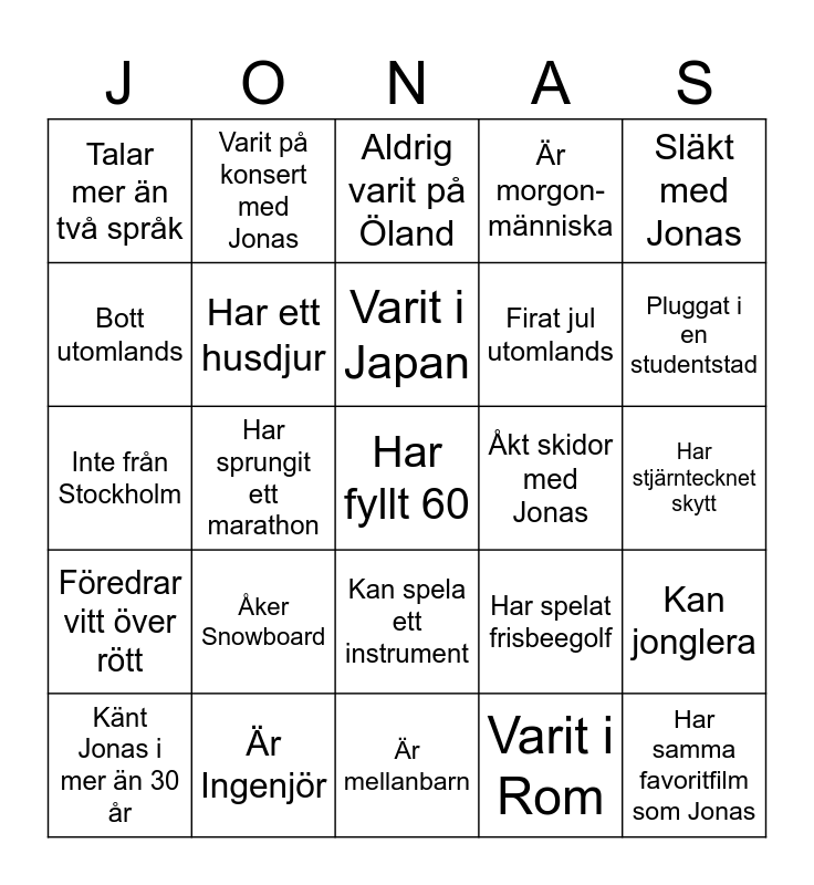 This bingo card has a free space and 24 words: Åker Snowboard, Är Ingenjör, Varit i Japan, Känt Jonas i mer än 30 år, Släkt med Jonas, Talar mer än två språk, Bott utomlands, Varit på konsert med Jonas, Åkt skidor med Jonas, Kan spela ett instrument, Firat jul utomlands, Inte från Stockholm, Har spelat frisbeegolf, Kan jonglera, Har ett husdjur, Varit i Rom, Har stjärntecknet skytt, Aldrig varit på Öland, Pluggat i en studentstad, Har sprungit ett marathon, Har samma favoritfilm som Jonas, Föredrar vitt över rött, Är morgon-människa and Är mellanbarn.
