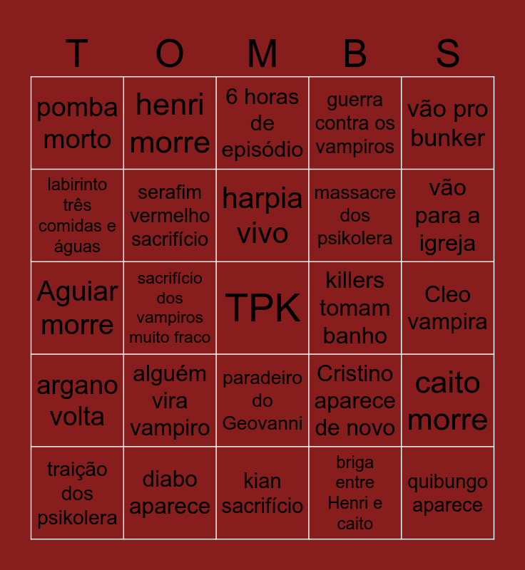 This bingo card has a free space and 24 words: alguém vira vampiro, diabo aparece, harpia vivo, traição dos psikolera, vão pro bunker, pomba morto, labirinto três comidas e águas, henri morre, killers tomam banho, paradeiro do Geovanni, massacre dos psikolera, Aguiar morre, Cristino aparece de novo, caito morre, serafim vermelho sacrifício, briga entre Henri e caito, Cleo vampira, 6 horas de episódio, vão para a igreja, sacrifício dos vampiros muito fraco, quibungo aparece, argano volta, guerra contra os vampiros and kian sacrifício.
