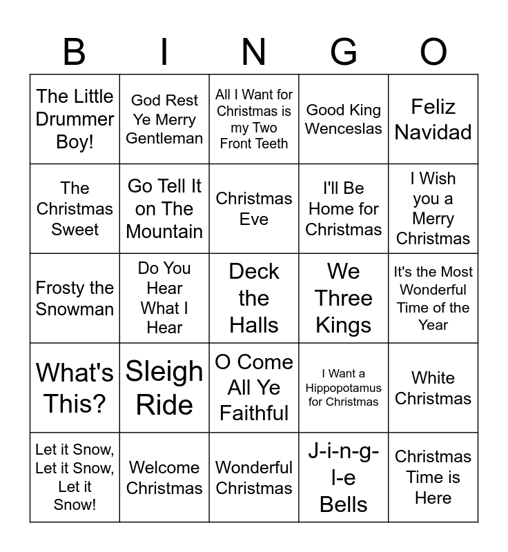 This bingo card has 77 words: Free!, A Holly Jolly Christmas, All I Want for Christmas is my Two Front Teeth, All I Want for Christmas is You, Angels We Have Heard on High, Away in the Manger, Believe, Blue Christmas, Carol of the Bells (Choir), Carol of the Bells, Christmas Time is Here, The Chipmunk Song, Christmas Eve, The Christmas Sweet, The Christmas Song, Do You Hear What I Hear, Dance of the Sugar Plum Fairy, Deck the Halls, Elves Just Want to have Fun, Feliz Navidad, The First Noel, Frosty the Snowman, Go Tell It on The Mountain, God Rest Ye Merry Gentleman, Good King Wenceslas, Grandma Got Ran Over By a Reindeer, The Hallelujah Chorus, Hark! The Harold Angels Sing, Have Yourself a Merry Little Christmas, Hot Chocolate, Here Comes Santa Clause, I Farted on Santa's Lap, I Saw Mommy Kissing Santa, I Want a Hippopotamus for Christmas, I Wish you a Merry Christmas, I'll Be Home for Christmas, It's a Marshmallow World, It's Beginning to Look a lot Like Christmas, It's the Most Wonderful Time of the Year, J-i-n-g-l-e Bells, Jingle Bells, Jingle Bell Rock, Jolly Old St. Nicholas, Joy to the World, Last Christmas, Let it Go, Let it Snow, Let it Snow, Let it Snow!, The Little Drummer Boy!, Mary Did You Know?, Mele Kalikimaka, O' Christmas Tree, O Come All Ye Faithful, O' Holy Night, O Little Town of Bethlehem, Rockin' Around the Christmas Tree, Rudolph the Red-Nosed Reindeer, Run Rudolph Run, Santa Clause Is Coming to Town, Santa Baby, Silver Bells, Sleigh Ride, Silent Night, Twelve Days of Christmas, Trim up the Tree, Underneath the Tree, Up on the House Top, Under the Mistletoe, We Three Kings, We Wish You a Merry Christmas, When Christmas Comes to Town, Where are You Christmas, White Christmas, What's This?, Welcome Christmas, Winter Wonder Land, Wonderful Christmas and You're a Mean One Mr. Grinch.