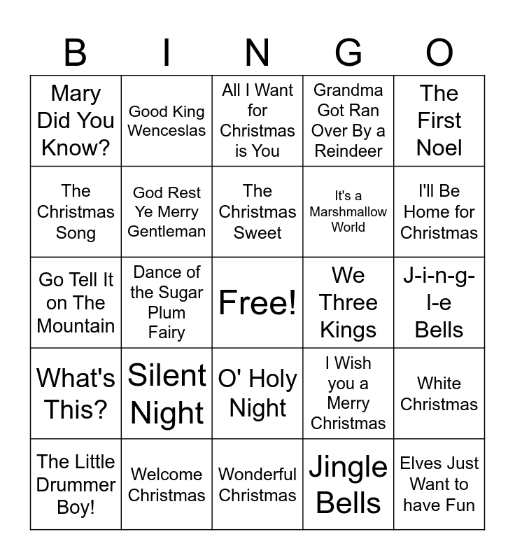 This bingo card has a free space and 76 words: A Holly Jolly Christmas, All I Want for Christmas is my Two Front Teeth, All I Want for Christmas is You, Angels We Have Heard on High, Away in the Manger, Believe, Blue Christmas, Carol of the Bells (Choir), Carol of the Bells, Christmas Time is Here, The Chipmunk Song, Christmas Eve, The Christmas Sweet, The Christmas Song, Do You Hear What I Hear, Dance of the Sugar Plum Fairy, Deck the Halls, Elves Just Want to have Fun, Feliz Navidad, The First Noel, Frosty the Snowman, Go Tell It on The Mountain, God Rest Ye Merry Gentleman, Good King Wenceslas, Grandma Got Ran Over By a Reindeer, The Hallelujah Chorus, Hark! The Harold Angels Sing, Have Yourself a Merry Little Christmas, Hot Chocolate, Here Comes Santa Clause, I Farted on Santa's Lap, I Saw Mommy Kissing Santa, I Want a Hippopotamus for Christmas, I Wish you a Merry Christmas, I'll Be Home for Christmas, It's a Marshmallow World, It's Beginning to Look a lot Like Christmas, It's the Most Wonderful Time of the Year, J-i-n-g-l-e Bells, Jingle Bells, Jingle Bell Rock, Jolly Old St. Nicholas, Joy to the World, Last Christmas, Let it Go, Let it Snow, Let it Snow, Let it Snow!, The Little Drummer Boy!, Mary Did You Know?, Mele Kalikimaka, O' Christmas Tree, O Come All Ye Faithful, O' Holy Night, O Little Town of Bethlehem, Rockin' Around the Christmas Tree, Rudolph the Red-Nosed Reindeer, Run Rudolph Run, Santa Clause Is Coming to Town, Santa Baby, Silver Bells, Sleigh Ride, Silent Night, Twelve Days of Christmas, Trim up the Tree, Underneath the Tree, Up on the House Top, Under the Mistletoe, We Three Kings, We Wish You a Merry Christmas, When Christmas Comes to Town, Where are You Christmas, White Christmas, What's This?, Welcome Christmas, Winter Wonder Land, Wonderful Christmas and You're a Mean One Mr. Grinch.