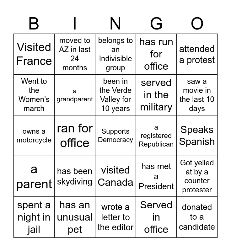 This bingo card has a free space and 33 words: saw Obama in person, saw Harris in person, ran for office, voted for first time in 2024, a parent, a grandparent, attended a protest, spent a night in jail, moved to AZ in last 24 months, born in AZ, been in the Verde Valley for 10 years, belongs to an Indivisible group, a registered Independent, a registered Democrat, a registered Republican, saw a movie in the last 10 days, has an unusual pet, owns a motorcycle, has been skydiving, has met a President, visited Canada, visited Mexico, Visited France, Speaks Spanish, wrote a letter to the editor, donated to a candidate, has run for office, served in the military, Went to the Women’s march, Got yelled at by a counter protester, Carried a sign, Served in office and Plays pickleball.