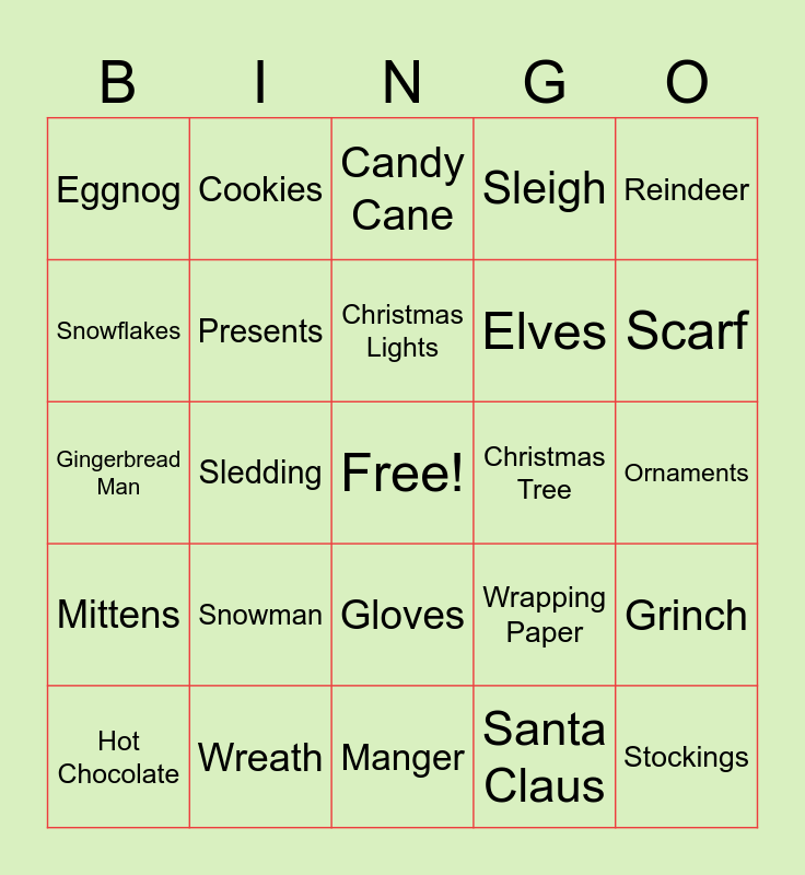 This bingo card has a free space and 24 words: Hot Chocolate, Snowman, Christmas Lights, Santa Claus, Reindeer, Eggnog, Cookies, Candy Cane, Christmas Tree, Ornaments, Gingerbread Man, Presents, Wrapping Paper, Grinch, Snowflakes, Wreath, Manger, Sleigh, Scarf, Mittens, Sledding, Gloves, Elves and Stockings.