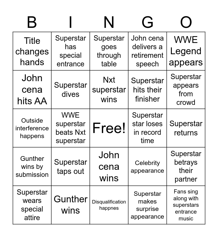 This bingo card has a free space and 24 words: Superstar taps out, Gunther wins, Nxt superstar wins, Superstar wears special attire, WWE Legend appears, Title changes hands, John cena hits AA, Superstar has special entrance, Superstar star loses in record time, John cena wins, Superstar hits their finisher, Outside interference happens, Celebrity appearance, Superstar betrays their partner, Superstar dives, Superstar makes surprise appearance, Superstar returns, Superstar goes through table, Superstar appears from crowd, WWE superstar beats Nxt superstar, Fans sing along with superstars entrance music, Gunther wins by submission, John cena delivers a retirement speech and Disqualification happnes.