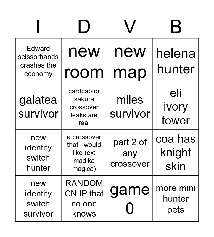 This bingo card has 16 words: RANDOM CN IP that no one knows, coa has knight skin, new map, Edward scissorhands crashes the economy, new identity switch hunter, new room, part 2 of any crossover, game 0, galatea survivor, cardcaptor sakura crossover leaks are real, new identity switch survivor, helena hunter, a crossover that I would like (ex: madika magica), eli ivory tower, miles survivor and more mini hunter pets.