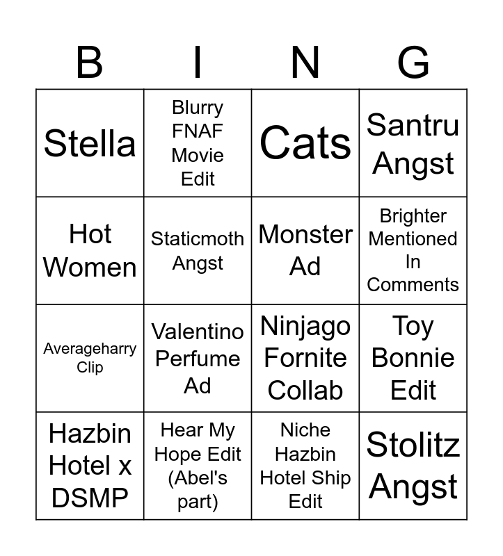 This bingo card has 16 words: Hear My Hope Edit (Abel's part), Toy Bonnie Edit, Cats, Stella, Averageharry Clip, Blurry FNAF Movie Edit, Ninjago Fornite Collab, Niche Hazbin Hotel Ship Edit, Hot Women, Staticmoth Angst, Hazbin Hotel x DSMP, Santru Angst, Valentino Perfume Ad, Brighter Mentioned In Comments, Monster Ad and Stolitz Angst.