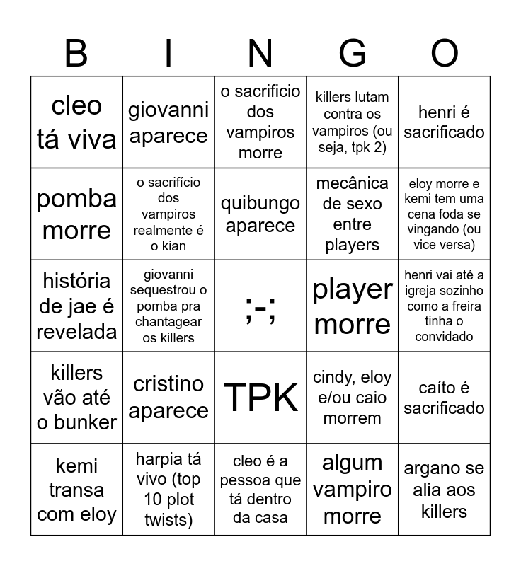 This bingo card has a free space and 24 words: cristino aparece, harpia tá vivo (top 10 plot twists), quibungo aparece, kemi transa com eloy, henri é sacrificado, cleo tá viva, pomba morre, giovanni aparece, player morre, TPK, mecânica de sexo entre players, história de jae é revelada, cindy, eloy e/ou caio morrem, caíto é sacrificado, o sacrifício dos vampiros realmente é o kian, algum vampiro morre, henri vai até a igreja sozinho como a freira tinha o convidado, o sacrificio dos vampiros morre, eloy morre e kemi tem uma cena foda se vingando (ou vice versa), giovanni sequestrou o pomba pra chantagear os killers, argano se alia aos killers, killers vão até o bunker, killers lutam contra os vampiros (ou seja, tpk 2) and cleo é a pessoa que tá dentro da casa.