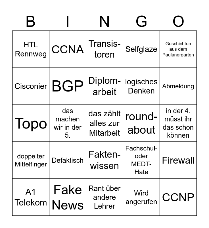 This bingo card has 25 words: Defaktisch, Rant über andere Lehrer, Diplom- arbeit, A1 Telekom, Geschichten aus dem Paulanergarten, HTL Rennweg, Cisconier, CCNA, round-about, Fakten-wissen, logisches Denken, Topo, Fachschul- oder MEDT-Hate, Firewall, BGP, CCNP, in der 4. müsst ihr das schon können, Transis-toren, Abmeldung, das machen wir in der 5., das zählt alles zur Mitarbeit, Fake News, doppelter Mittelfinger, Selfglaze and Wird angerufen.