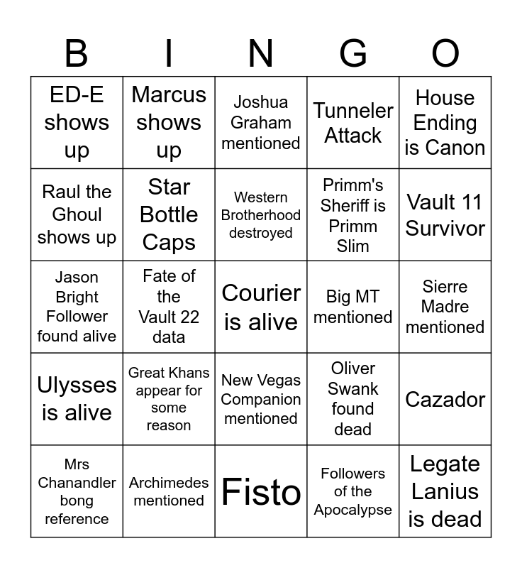 This bingo card has a free space and 24 words: Great Khans appear for some reason, Archimedes mentioned, Western Brotherhood destroyed, Mrs Chanandler bong reference, House Ending is Canon, ED-E shows up, Raul the Ghoul shows up, Marcus shows up, Big MT mentioned, New Vegas Companion mentioned, Primm's Sheriff is Primm Slim, Jason Bright Follower found alive, Oliver Swank found dead, Cazador, Star Bottle Caps, Followers of the Apocalypse, Sierre Madre mentioned, Joshua Graham mentioned, Vault 11 Survivor, Fate of the Vault 22 data, Legate Lanius is dead, Ulysses is alive, Tunneler Attack and Fisto.