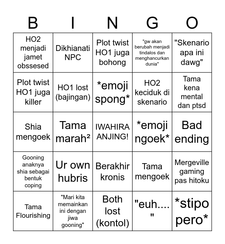 This bingo card has a free space and 24 words: Ur own hubris, "Mari kita memainkan ini dengan jiwa gooning", *emoji spong*, Tama Flourishing, "Skenario apa ini dawg", HO2 menjadi jamet obssesed, Plot twist HO1 juga killer, Dikhianati NPC, *emoji ngoek*, Berakhir kronis, HO2 keciduk di skenario, Shia mengoek, Tama mengoek, Mergeville gaming pas hitoku, HO1 lost (bajingan), "euh.... ", Bad ending, Plot twist HO1 juga bohong, Tama kena mental dan ptsd, Tama marah², *stipo pero*, Gooning anaknya shia sebagai bentuk coping, "gw akan berubah menjadi tindalos dan menghancurkan dunia" and Both lost (kontol).