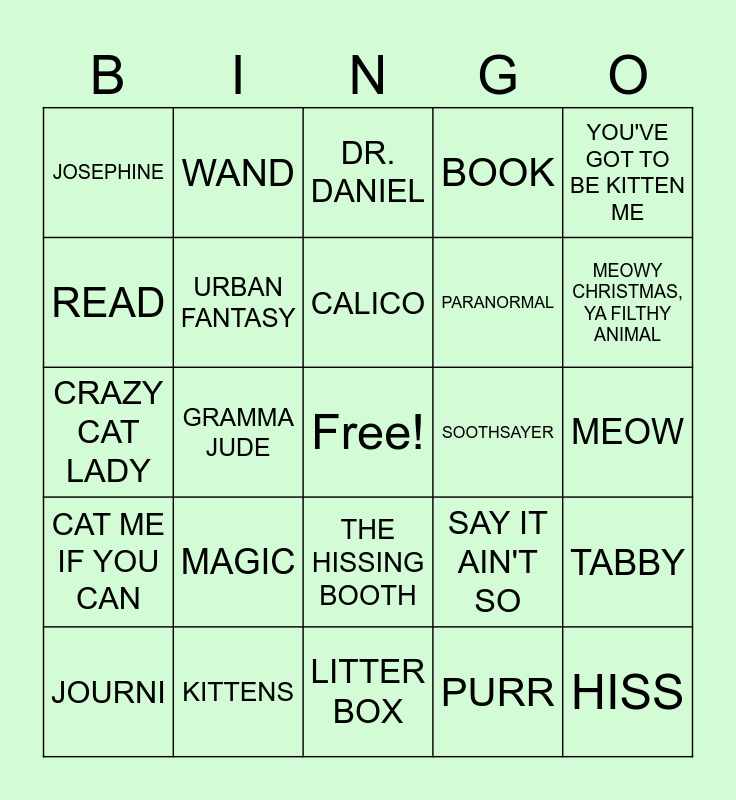 This bingo card has a free space and 29 words: JOURNI, CATS, GRAMMA JUDE, AUNT FRIEDA, JOSEPHINE, DR. DANIEL, URBAN FANTASY, MAGIC, SOOTHSAYER, KITTENS, MEOW, HISS, LITTER BOX, PURR, MEOWY CHRISTMAS, YA FILTHY ANIMAL, GEMMA THORNE, THE HISSING BOOTH, CAT ME IF YOU CAN, YOU'VE GOT TO BE KITTEN ME, CRAZY CAT LADY, SAY IT AIN'T SO, SUPERNATURAL, PARANORMAL, READ, BOOK, WAND, TABBY, CALICO and WITCH.