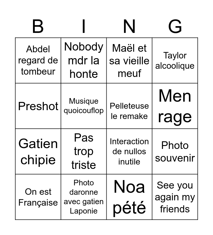 This bingo card has 16 words: Photo daronne avec gatien Laponie, Photo souvenir, Maël et sa vieille meuf, Abdel regard de tombeur, Gatien chipie, Nobody mdr la honte, Interaction de nullos inutile, Noa pété, Preshot, Musique quoicouflop, On est Française, Taylor alcoolique, Pas trop triste, Men rage, Pelleteuse le remake and See you again my friends.