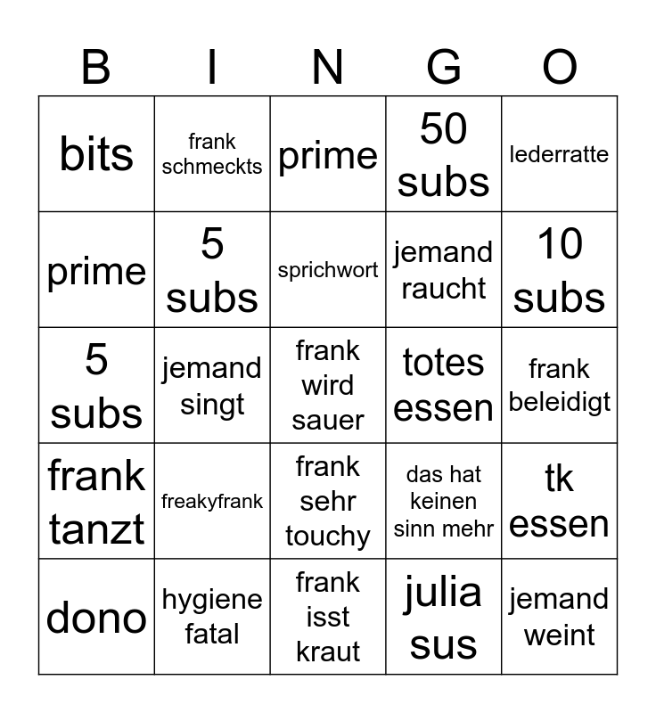 This bingo card has a free space and 24 words: freakyfrank, hygiene fatal, sprichwort, dono, lederratte, bits, prime, frank schmeckts, totes essen, frank sehr touchy, jemand raucht, 5 subs, das hat keinen sinn mehr, tk essen, 5 subs, julia sus, frank beleidigt, prime, 10 subs, jemand singt, jemand weint, frank tanzt, 50 subs and frank isst kraut.