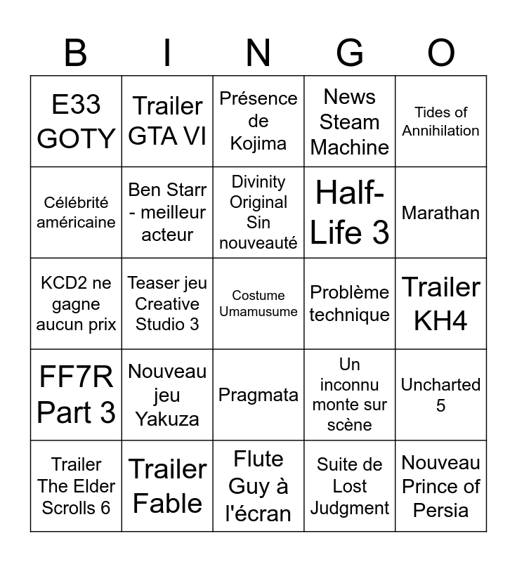 This bingo card has a free space and 24 words: Nouveau jeu Yakuza, Trailer Fable, Divinity Original Sin nouveauté, Trailer The Elder Scrolls 6, Tides of Annihilation, E33 GOTY, Célébrité américaine, Trailer GTA VI, Problème technique, Pragmata, Half-Life 3, KCD2 ne gagne aucun prix, Un inconnu monte sur scène, Uncharted 5, Ben Starr - meilleur acteur, Suite de Lost Judgment, Trailer KH4, Présence de Kojima, Marathan, Teaser jeu Creative Studio 3, Nouveau Prince of Persia, FF7R Part 3, News Steam Machine and Flute Guy à l'écran.