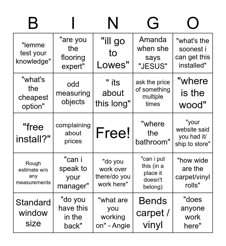 This bingo card has a free space and 24 words: "can i speak to your manager", "do you have this in the back", " its about this long", Standard window size, "what's the soonest i can get this installed", "lemme test your knowledge", "what's the cheapest option", "are you the flooring expert", "where the bathroom", "do you work over there/do you work here", ask the price of something multiple times, "free install?", "can i put this (in a place it doesn't belong), "how wide are the carpet/vinyl rolls", odd measuring objects, Bends carpet / vinyl, "your website said you had it/ ship to store", "ill go to Lowes", "where is the wood", complaining about prices, "does anyone work here", Rough estimate w/o any measurements, Amanda when she says "JESUS" and "what are you working on" - Angie.