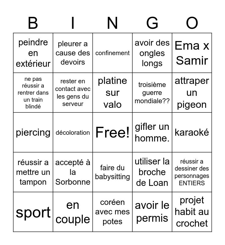 This bingo card has a free space and 24 words: accepté à la Sorbonne, en couple, platine sur valo, sport, Ema x Samir, peindre en extérieur, ne pas réussir a rentrer dans un train blindé, pleurer a cause des devoirs, gifler un homme., faire du babysitting, troisième guerre mondiale??, piercing, utiliser la broche de Loan, réussir a dessiner des personnages ENTIERS, rester en contact avec les gens du serveur, avoir le permis, karaoké, confinement, attraper un pigeon, décoloration, projet habit au crochet, réussir a mettre un tampon, avoir des ongles longs and coréen avec mes potes.