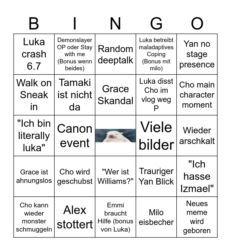 This bingo card has a free space and 24 words: Cho wird geschubst, Alex stottert, Grace Skandal, Cho kann wieder monster schmuggeln, Yan no stage presence, Luka crash 6.7, Walk on Sneak in, Demonslayer OP oder Stay with me (Bonus wenn beides), Viele bilder, "Wer ist Williams?", Luka disst Cho im vlog weg P, "Ich bin literally luka", Trauriger Yan Blick, "Ich hasse Izmael", Tamaki ist nicht da, Milo eisbecher, Wieder arschkalt, Random deeptalk, Cho main character moment, Canon event, Neues meme wird geboren, Grace ist ahnungslos, Luka betreibt maladaptives Coping (Bonus mit milo) and Emmi braucht Hilfe (bonus von Luka).