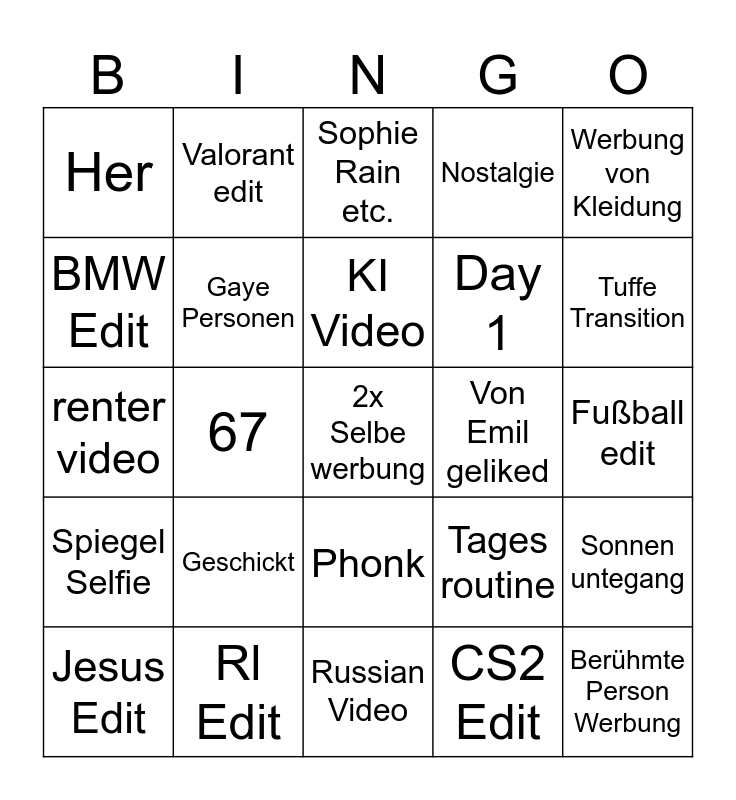This bingo card has a free space and 24 words: Geschickt, Rl Edit, KI Video, Jesus Edit, Werbung von Kleidung, Her, BMW Edit, Valorant edit, Von Emil geliked, Phonk, Day 1, renter video, Tages routine, Sonnen untegang, Gaye Personen, CS2 Edit, Fußball edit, Sophie Rain etc., Tuffe Transition, 67, Berühmte Person Werbung, Spiegel Selfie, Nostalgie and Russian Video.