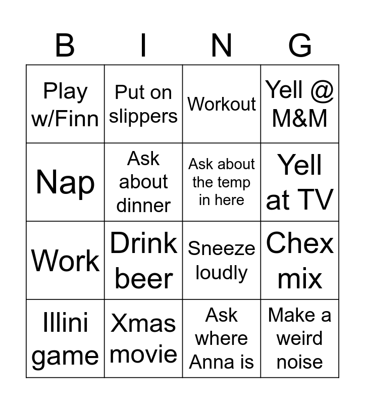 This bingo card has 16 words: Xmas movie, Chex mix, Workout, Play w/Finn, Work, Put on slippers, Sneeze loudly, Ask where Anna is, Nap, Ask about dinner, Illini game, Yell @ M&M, Drink beer, Yell at TV, Ask about the temp in here and Make a weird noise.