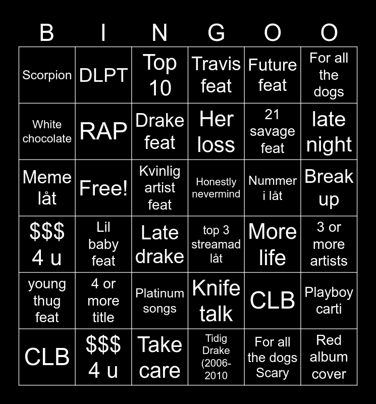 This bingo card has 40 words: Take care, 21 savage feat, pnd feat, White chocolate, top 3 streamad låt, Break up, RAP, Singel, Future feat, Honestly nevermind, late night, Travis feat, Meme låt, Kvinlig artist feat, Free!, Nummer i låt, Playboy carti, Scorpion, Tidig Drake (2006-2010, Top 10, Lil baby feat, 3 or more artists, Drake feat, For all the dogs, For all the dogs Scary, Knife talk, 4 or more title, Red album cover, young thug feat, Platinum songs, NWTS, Late drake, CLB, $$$ 4 u, Her loss, More life, CLB, $$$ 4 u, DLPT and More life.