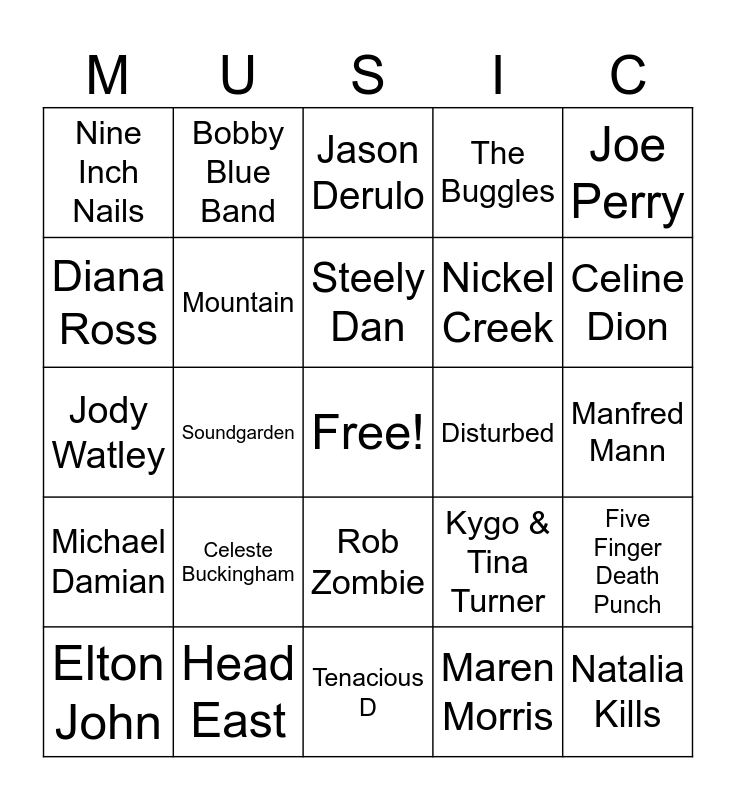 This bingo card has a free space and 59 words: Gin Blossoms, Head East, Liam Payne, Michael Damian, Maren Morris, George Michael, Mountain, Slash & Myles, Nickel Creek, The Power Station, The Buggles, Jon Langston, Diana Ross, Miley Cyrus, Thomas Rhett, Nine Inch Nails, Natalia Kills, Joe Perry, Mr Big, Steely Dan, Disturbed, Jason Derulo, Elton John, Five Finger Death Punch, Gabby Barrett, Ace of Base, Genesis, Black Box, Celine Dion, Counting Crows, Pretty Poison, Kim Wilde & Boy George, Chris Cornell, The Pretty Reckless, Bobby Blue Band, Blind Melon, Melissa Etheridge, Soundgarden, Against the Current, Jody Watley, The Yardbirds, Celeste Buckingham, Manfred Mann, Nelly Furtado, Robert Plant, Shinedown, The Grass Roots, Fall Out Boy, Rob Zombie, Tenacious D, West Side Story, The Tokens, Gnarls Barkley, Lou Rawls, Weird Al, Kygo & Tina Turner, Jamiroquai, Grace Potter & The Nocturnals and Kane Brown & Jelly Roll.