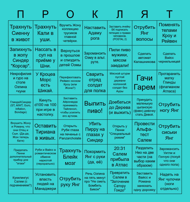 This bingo card has a free space and 48 words: 20:31 Салем прибыла в Атлас, Сделать автомат Калашникова, Речь Озпина на пять минут про "Не сметь Бомбить Бикон", Кинуть d100 на 100 при игре в настолку., Перефехтовать Рейвен носком Кроу (или Жона?), Отрубить ногу Янг, Трахнуть Кали в уши., Установить власть людей на Манаджери, Отрубить Янг волосы, Убить Пирру на глазах у Синдер, Поменять телами Кроу и Рейвен, Наставить Адаму рога, Гачи Гарем, Мясной штурм пустой деревни колонной солдат без Ауры, Приделать Пенни дополнительный прибор для "атаки", Принудить маленькую цыганскую (фавн) девочку стать Девой., Запихнуть в жопу Синдер "Корсар"., Сделать Вайсс чернильницей, Разделить Нео на две части (на выбор каким образом), Заставить ячейку БК подписать петицию о правах человеков. (POSTAL 2), Пили пиво мужики, мясом заедали!, Заставить Айронвуда принимать Тайленол, чтобы усилить его аутизм., Трахнуть Сиенну в живот, Нассать в суп на приёме у Шни., Заромансить Уитли и Гончую (похуй что они одного пола), Вернуться в прошлое и спиздить детей Озмы, Протаранить матку Глинды (флагманом Атласа), Кунилингус Салем (с подчинением?), Сварить отряд солдат для полка, У Кроцеа Морс есть Шикай., Заставить Вайсс и Романа занюхать одну дорожку, Доебаться до Дерева (и выжить), Отрубить сиськи Янг, Руби и Вайсс в романтическом обмене наркотой (перорально), ГлиндаXСиндер (ST, AtWT, Guro, Inflation, Bondage), Открыть у Пенни "Специальный режим", Провести Альфа-тест Салем, Некрофилия и гуро на столе Озпина +куни, Открыть Руби глаза на печенье с Panzarcholate, Трахнуть Блейк мозг, Внушить Жону и Роману, что они Отец и Сын. (Да-да, Жон теперь батя), Надеть на Янг чулочки (ноги отдельно), Вручить Жону коллекцию трусиков главной четвёрки., Отрубить руку Янг, Заромансить Озму в альт. руте., Покормить Янг с руки (да, её), Оставить Тириана в живых. and Превратить Салем в "Заточение Сатору Гождо".