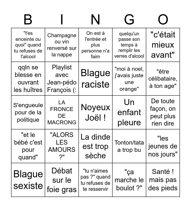 This bingo card has a free space and 24 words: "ALORS LES AMOURS ?", Débat sur le foie gras, Blague raciste, Blague sexiste, "c'était mieux avant", "t'es enceinte ou quoi" quand tu refuses de l'alcool, qqln se blesse en ouvrant les huîtres, Champagne ou vin renversé sur la nappe, Un enfant pleure, La dinde est trop sèche, "moi à noel, j'avais juste une orange", S'engueule pour de la politique, Tonton/tata a trop bu, "les jeunes de nos jours", Playlist avec Jean-pédo François (:, "ça marche le boulot ?", De toute façon, on peut plus rien dire, On est à l'entrée et plus personne n'a faim, "être célibataire, à ton age", LA FRONCE DE MACRONG, Santé ! mais pas des pieds, "et le bébé c'est pour quand", quelqu'un passe son temps à remplir les verres d'alcool and "tu n'aimes pas ?" quand tu refuses de te resservir.