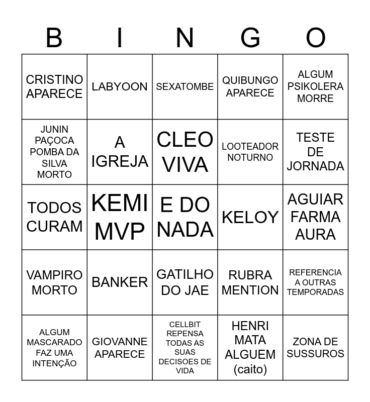 This bingo card has a free space and 24 words: BANKER, GIOVANNE APARECE, CLEO VIVA, ALGUM MASCARADO FAZ UMA INTENÇÃO, ALGUM PSIKOLERA MORRE, CRISTINO APARECE, JUNIN PAÇOCA POMBA DA SILVA MORTO, LABYOON, KELOY, GATILHO DO JAE, LOOTEADOR NOTURNO, TODOS CURAM, RUBRA MENTION, REFERENCIA A OUTRAS TEMPORADAS, A IGREJA, HENRI MATA ALGUEM (caito), AGUIAR FARMA AURA, SEXATOMBE, TESTE DE JORNADA, KEMI MVP, ZONA DE SUSSUROS, VAMPIRO MORTO, QUIBUNGO APARECE and CELLBIT REPENSA TODAS AS SUAS DECISOES DE VIDA.