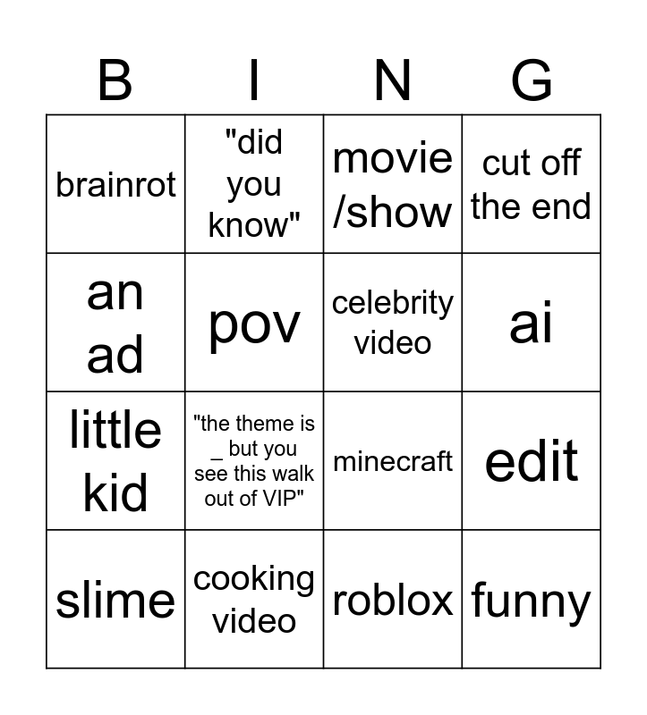 This bingo card has 16 words: cooking video, edit, movie /show, brainrot, little kid, "did you know", minecraft, roblox, an ad, pov, slime, cut off the end, "the theme is _ but you see this walk out of VIP", ai, celebrity video and funny.