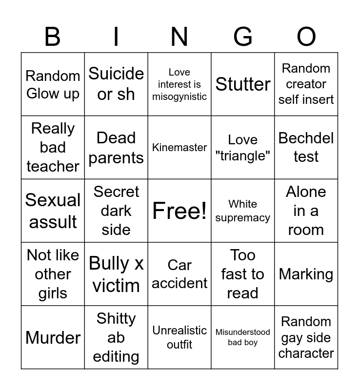 This bingo card has a free space and 32 words: Misunderstood bad boy, Abusive alcoholic dad, Secret dark side, Censorship, Not like other girls, Dead parents, Random creator self insert, Marking, Suicide or sh, Mafia, Kinemaster, Love interest is misogynistic, Food humor, Furries, White supremacy, Omegaverse, Murder, Sexual assult, Car accident, Bully x victim, Too fast to read, Rooftop scene, Alone in a room, Shitty ab editing, Random gay side character, Stutter, Love "triangle", Really bad teacher, Random Glow up, Unrealistic outfit, Gains magical powers and Bechdel test.