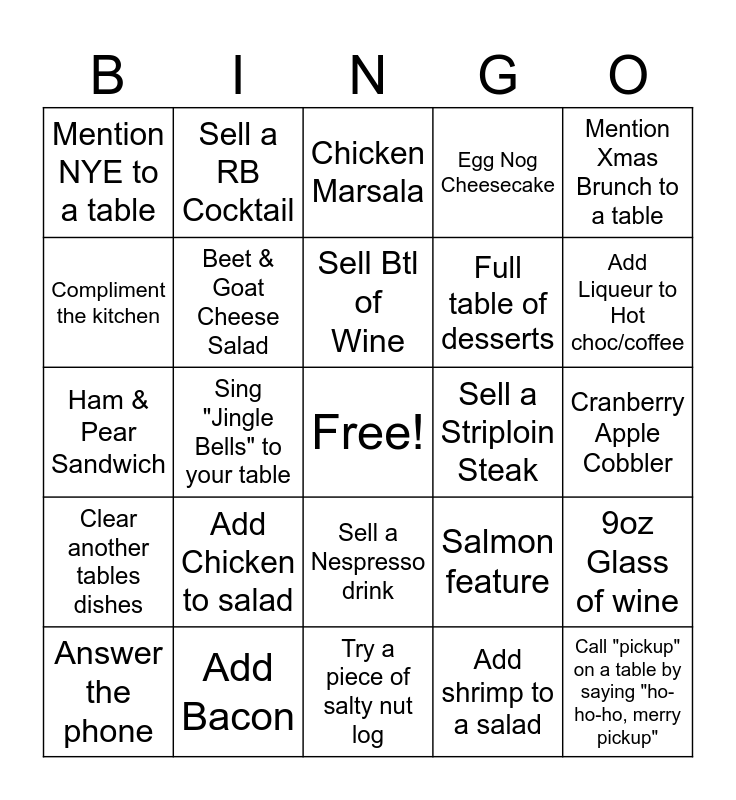 This bingo card has a free space and 24 words: Add Chicken to salad, Add Bacon, Sell Btl of Wine, Answer the phone, Mention Xmas Brunch to a table, Mention NYE to a table, Compliment the kitchen, Sell a RB Cocktail, Sell a Striploin Steak, Sell a Nespresso drink, Full table of desserts, Ham & Pear Sandwich, Salmon feature, 9oz Glass of wine, Beet & Goat Cheese Salad, Add shrimp to a salad, Cranberry Apple Cobbler, Chicken Marsala, Add Liqueur to Hot choc/coffee, Sing "Jingle Bells" to your table, Call "pickup" on a table by saying "ho-ho-ho, merry pickup", Clear another tables dishes, Egg Nog Cheesecake and Try a piece of salty nut log.