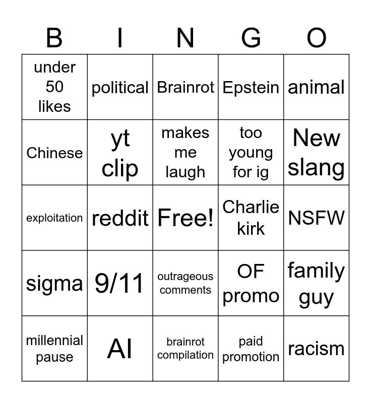 This bingo card has a free space and 24 words: 9/11, AI, makes me laugh, millennial pause, animal, under 50 likes, Chinese, political, Charlie kirk, outrageous comments, too young for ig, exploitation, OF promo, family guy, yt clip, paid promotion, NSFW, Brainrot, New slang, reddit, racism, sigma, Epstein and brainrot compilation.