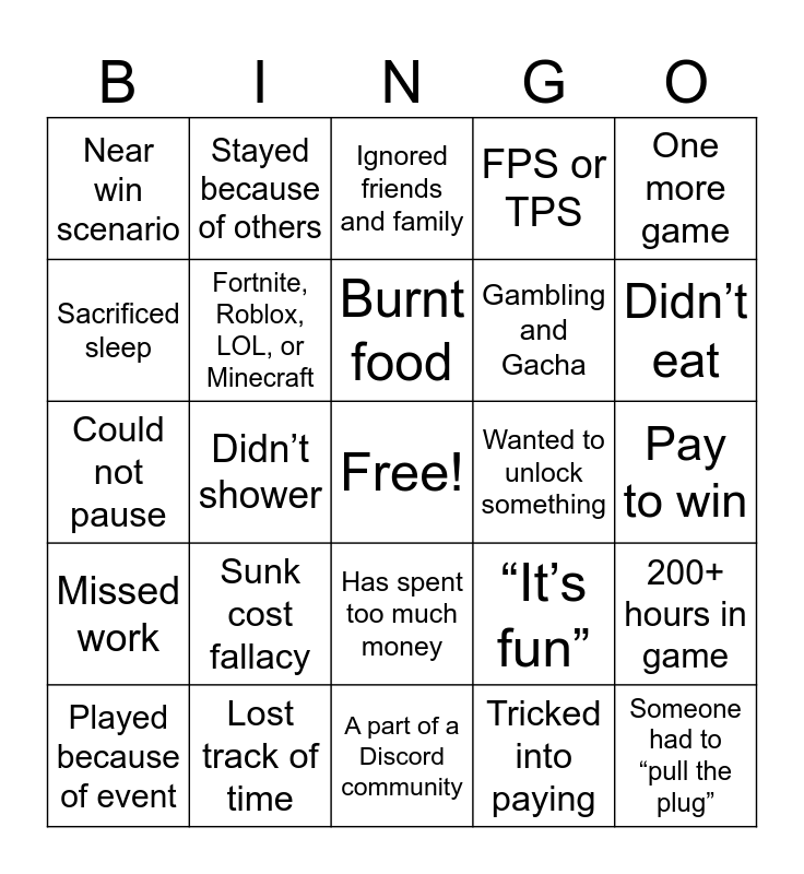 This bingo card has a free space and 24 words: Sunk cost fallacy, Lost track of time, Burnt food, Played because of event, One more game, Near win scenario, Sacrificed sleep, Stayed because of others, Wanted to unlock something, Has spent too much money, Gambling and Gacha, Could not pause, “It’s fun”, 200+ hours in game, Fortnite, Roblox, LOL, or Minecraft, Tricked into paying, Pay to win, Ignored friends and family, Didn’t eat, Didn’t shower, Someone had to “pull the plug”, Missed work, FPS or TPS and A part of a Discord community.