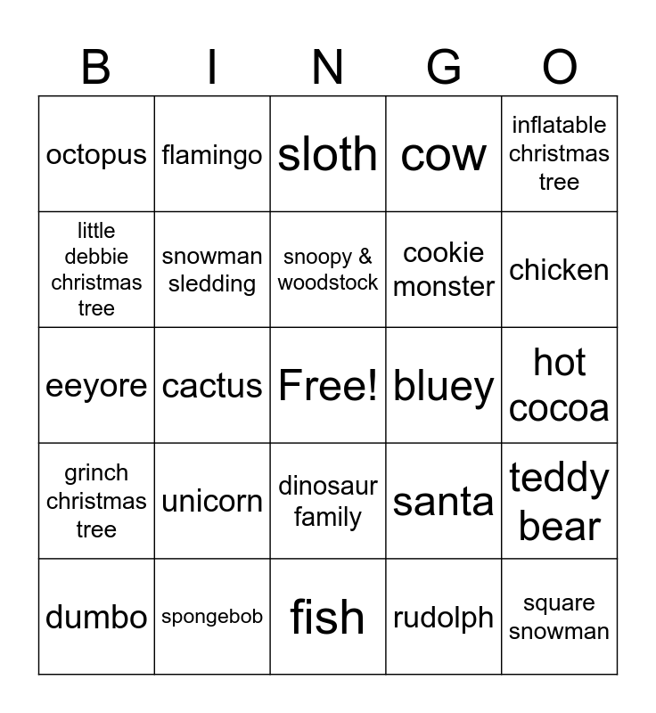 This bingo card has a free space and 24 words: unicorn, spongebob, snoopy & woodstock, dumbo, inflatable christmas tree, octopus, little debbie christmas tree, flamingo, bluey, dinosaur family, cookie monster, eeyore, santa, teddy bear, snowman sledding, rudolph, hot cocoa, sloth, chicken, cactus, square snowman, grinch christmas tree, cow and fish.