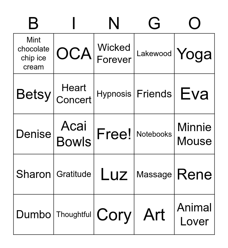 This bingo card has a free space and 29 words: Dumbo, Cory, Acai Bowls, Family, Mint chocolate chip ice cream, Wicked Forever, Heart Concert, Gratitude, Notebooks, Thoughtful, Minnie Mouse, Animal Lover, Cory, Art, Eva, Taya, Luz, Sharon, Yoga, Denise, Massage, Fridays, Friends, Betsy, Lakewood, OCA, Rene, Hypnosis and Wicked.