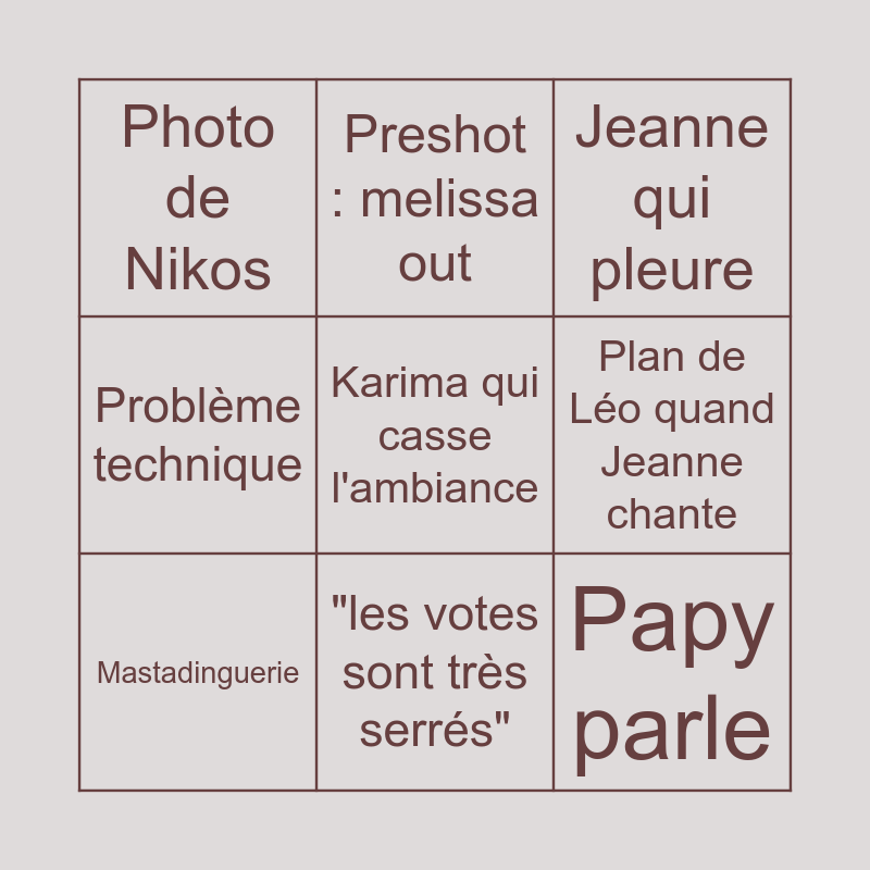 This bingo card has a free space and 8 words: Plan de Léo quand Jeanne chante, Jeanne qui pleure, Preshot : melissa out, Mastadinguerie, Photo de Nikos, Papy parle, Problème technique and "les votes sont très serrés".