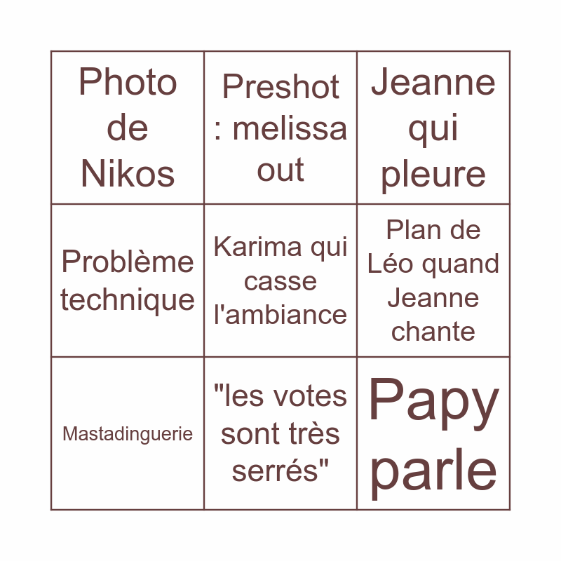 This bingo card has a free space and 8 words: Plan de Léo quand Jeanne chante, Jeanne qui pleure, Preshot : melissa out, Mastadinguerie, Photo de Nikos, Papy parle, Problème technique and "les votes sont très serrés".