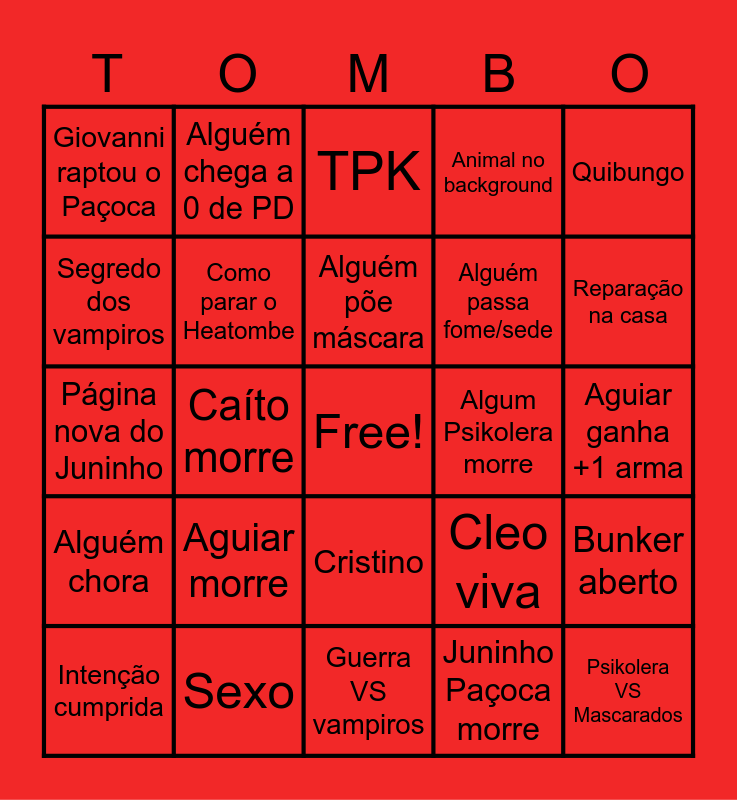 This bingo card has a free space and 24 words: Aguiar morre, Sexo, Alguém põe máscara, Intenção cumprida, Quibungo, Giovanni raptou o Paçoca, Segredo dos vampiros, Alguém chega a 0 de PD, Algum Psikolera morre, Cristino, Alguém passa fome/sede, Página nova do Juninho, Cleo viva, Bunker aberto, Como parar o Heatombe, Juninho Paçoca morre, Aguiar ganha +1 arma, TPK, Reparação na casa, Caíto morre, Psikolera VS Mascarados, Alguém chora, Animal no background and Guerra VS vampiros.