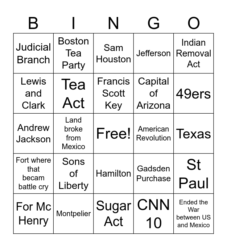 This bingo card has a free space and 35 words: Free Speech, Right to Bare Arms, George Washington, Tea Act, Hamilton, Jefferson, Lewis and Clark, Sacagawea, Francis Scott Key, War of 1812, Andrew Jackson, Indian Removal Act, Executive Branch, Legislative Branch, Judicial Branch, American Revolution, CNN 10, Land broke from Mexico, Fort where that becam battle cry, Ended the War between US and Mexico, Gadsden Purchase, For Mc Henry, St Paul, Montpelier, Sam Houston, 49ers, Sluice mining, Capital of California, Capital of Arizona, Texas, St paul, Sugar Act, Sons of Liberty, Boston Tea Party and Boston Massacre.