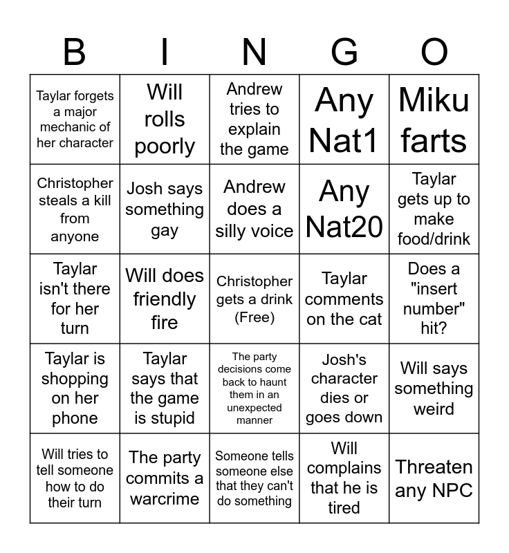 This bingo card has a free space and 24 words: Taylar says that the game is stupid, The party commits a warcrime, Andrew does a silly voice, Will tries to tell someone how to do their turn, Miku farts, Taylar forgets a major mechanic of her character, Christopher steals a kill from anyone, Will rolls poorly, Taylar comments on the cat, The party decisions come back to haunt them in an unexpected manner, Any Nat20, Taylar isn't there for her turn, Josh's character dies or goes down, Will says something weird, Josh says something gay, Will complains that he is tired, Does a "insert number" hit?, Andrew tries to explain the game, Taylar gets up to make food/drink, Will does friendly fire, Threaten any NPC, Taylar is shopping on her phone, Any Nat1 and Someone tells someone else that they can't do something.