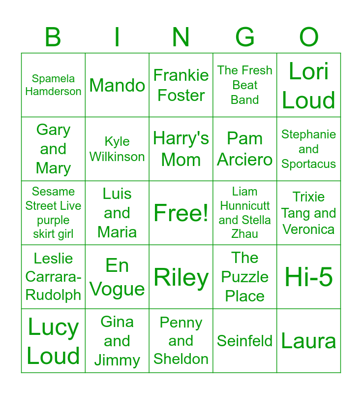 This bingo card has a free space and 100 words: Leela, Janice, Trixie Tang and Veronica, The Dirt Sisters, Kari, Lori and Leni, Sofia and Baileywick, Joe and Steve, Ballerina Puppet, Wayne and Wanda, Round and round, Annie Sue Pig, Princess Amber, Gina and Jimmy, Roberta, Ted Harris, Pam Arciero, The four girls, Vanessa from Bee Movie, Luan Loud, Ronnie Anne and Sid Chang, Gabi and Miles, Maria, Adrianna, Elizabeth Banks, Liam Hunnicutt and Stella Zhau, Lori Loud, The Puzzle Place, Luna Loud, Debra, Luis and Maria, Spamela Hamderson, The driver on the bus goes honk honk honk, Corner Gas, Seinfeld, Harry's Mom, Hi-5, Maria Santiago, Elmyra Duff, The Brothers Chaps, Mercedes, The Kids, Sesame Street Live purple skirt girl, Gina, Stephanie and Sportacus, Frankie Foster, Linda Flynn-Fletcher, Christmas Eve, Lisa Loud, Penny and Sheldon, Dominique, Krista and Maggie, Butch Hartman, Little People (Sarah Lynn, maybe?), Denise Nickerson getting romantic with her two boyfriends, Skip Hinnant and Luis Avalos, The Pointer Sisters, Bobby's World, Community, Nick and Sally, Pooby, The Fresh Beat Band, Daniel Thrasher, Alex Kimble, Edna Krabappel, Kari, Two and a Half Men, Cheryl and Meryl, The Doodlebops, Lynn Loud, Anything Muppets, Laurie Berkner, Matt, Jackie and Inez, En Vogue, Suzi Shelton, Princess Fiona, Timmy's Mom, Christie Glamorpuss, Susie from VeggieTales, Gary and Mary, Prairie Dawn, Lola Loud, Stephanie D'Abruzzo, Laura, Logan, Riley, Chris, Mando, Woody and Bo Peep, George Sr. and Mary, Gabi, Leslie Carrara-Rudolph, Lana Loud, Cindy Vortex, Kids from Barney and Friends, Lucy Loud, Kyle Wilkinson, Ronnie Anne and Bobby, Any Disney Princesses, Lori and Leni, Leni Loud and Logan and Chilly.