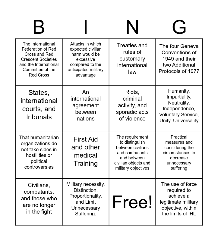 This bingo card has 17 words: Free!, Civilians, combatants, and those who are no longer in the fight, Treaties and rules of customary international law, The International Federation of Red Cross and Red Crescent Societies and the International Committee of the Red Cross, First Aid and other medical Training, The four Geneva Conventions of 1949 and their two Additional Protocols of 1977, Practical measures and considering the circumstances to decrease unnecessary suffering, Riots, criminal activity, and sporadic acts of violence, Humanity, Impartiality, Neutrality, Independence, Voluntary Service, Unity, Universality, An international agreement between nations, Military necessity, Distinction, Proportionality, and Limit Unnecessary Suffering., The requirement to distinguish between civilians and combatants and between civilian objects and military objectives, States, international courts, and tribunals, Attacks in which expected civilian harm would be excessive compared to the anticipated military advantage, That humanitarian organizations do not take sides in hostilities or political controversies, During armed conflicts, both international and non-international and The use of force required to achieve a legitimate military objective, within the limits of IHL.