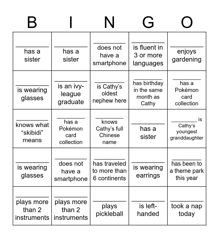 This bingo card has 225 words: _________ is wearing the same color top as you, _________ is left-handed, _________ has traveled to more than 6 continents, _________ is Cathy’s longest friend, _________ has birthday in the same month as Cathy, _________ is an ivy-league graduate, _________ traveled the farthest to get here, _________ can solve a Rubik’s Cube, _________ has a pet cat, _________ has a sister, _________ name starts with the same letter as yours, _________ is wearing red, _________ is wearing glasses, _________ has seen K-Pop Demon Hunters, _________ has been to Hawaii more than 5 times, _________’s favorite color is the same as Cathy’s, _________ plays a band instrument, _________ doesn’t drink coffee, _________ is Cathy’s oldest nephew here, _________ is Cathy’s youngest granddaughter, _________ drives a white car, _________ is wearing contact lenses, _________ has ran in a 5K, _________ lives outside of the Bay Area, _________ has been to a theme park this year, _________ is wearing braces, _________ supported a charity this month, _________ has taught in a classroom, _________ enjoys gardening, _________ plays the piano, _________ has a Pokémon card collection, _________ has been on a cruise, _________ likes to sing karaoke, _________ is fluent in 3 or more languages, _________ is wearing a regular watch (not a smartwatch), _________ knows Cathy’s full Chinese name, _________ is wearing earrings, _________ enjoys watching crime dramas, _________ has a summer birthday, _________ plays golf, _________ likes to draw, _________ is the youngest sibling in their family, _________ took a nap today, _________ does martial arts, _________ was born in another country, _________ knows what “skibidi” means, _________ does not have a smartphone, _________ has not finished Christmas shopping, _________ plays pickleball, _________ is left-handed, _________ has traveled to more than 6 continents, _________ is Cathy’s longest friend, _________ has birthday in the same month as Cathy, _________ is an ivy-league graduate, _________ traveled the farthest to get here, _________ can solve a Rubik’s Cube, _________ has a pet cat, _________ has a sister, _________ name starts with the same letter as yours, _________ is wearing red, _________ is wearing glasses, _________ has seen K-Pop Demon Hunters, _________ has been to Hawaii more than 5 times, _________’s favorite color is the same as Cathy’s, _________ plays a band instrument, _________ doesn’t drink coffee, _________ is Cathy’s oldest nephew here, _________ is Cathy’s youngest granddaughter, _________ drives a white car, _________ is wearing contact lenses, _________ has ran in a 5K, _________ lives outside of the Bay Area, _________ has been to a theme park this year, _________ is wearing braces, _________ supported a charity this month, _________ has taught in a classroom, _________ enjoys gardening, _________ plays the piano, _________ has a Pokémon card collection, _________ has been on a cruise, _________ likes to sing karaoke, _________ is fluent in 3 or more languages, _________ is wearing a regular watch (not a smartwatch), _________ knows Cathy’s full Chinese name, _________ is wearing earrings, _________ enjoys watching crime dramas, _________ has a summer birthday, _________ plays golf, _________ likes to draw, _________ is the youngest sibling in their family, _________ took a nap today, _________ does martial arts, _________ was born in another country, _________ knows what “skibidi” means, _________ does not have a smartphone, _________ has not finished Christmas shopping, _________ plays pickleball, _________ arrived late to the party, _________ is born in year of the monkey, _________ attended the same school as Cathy, _________ has been to Hong Kong within the last year, _________ first name begins with the letter “C”, _________ is wearing the same color top as you, _________ plays more than 2 instruments, _________ went to Costco in the last week, _________ has never eaten at this restaurant before, _________ arrived late to the party, _________ is born in year of the monkey, _________ attended the same school as Cathy, _________ has been to Hong Kong within the last year, _________ first name begins with the letter “C”, _________ is wearing the same color top as you, _________ plays more than 2 instruments, _________ is left-handed, _________ has traveled to more than 6 continents, _________ is Cathy’s longest friend, _________ has birthday in the same month as Cathy, _________ is an ivy-league graduate, _________ traveled the farthest to get here, _________ can solve a Rubik’s Cube, _________ has a pet cat, _________ has a sister, _________ is the youngest sibling in their family, _________ took a nap today, _________ does martial arts, _________ was born in another country, _________ knows what “skibidi” means, _________ does not have a smartphone, _________ has not finished Christmas shopping, _________ plays pickleball, _________ name starts with the same letter as yours, _________ is wearing red, _________ is wearing glasses, _________ has seen K-Pop Demon Hunters, _________ has been to Hawaii more than 5 times, _________’s favorite color is the same as Cathy’s, _________ plays a band instrument, _________ doesn’t drink coffee, _________ is Cathy’s oldest nephew here, _________ is Cathy’s youngest granddaughter, _________ drives a white car, _________ is wearing contact lenses, _________ has ran in a 5K, _________ lives outside of the Bay Area, _________ has been to a theme park this year, _________ is wearing braces, _________ supported a charity this month, _________ has taught in a classroom, _________ enjoys gardening, _________ plays the piano, _________ has a Pokémon card collection, _________ has been on a cruise, _________ likes to sing karaoke, _________ is fluent in 3 or more languages, _________ is wearing a regular watch (not a smartwat