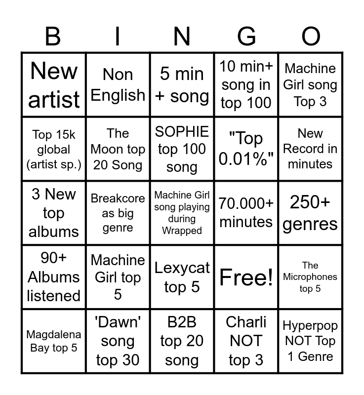 This bingo card has 25 words: Machine Girl top 5, B2B top 20 song, SOPHIE top 100 song, Magdalena Bay top 5, Machine Girl song Top 3, New artist, Top 15k global (artist sp.), Non English, 70.000+ minutes, Lexycat top 5, "Top 0.01%", 3 New top albums, Free!, The Microphones top 5, The Moon top 20 Song, Hyperpop NOT Top 1 Genre, 250+ genres, 5 min + song, New Record in minutes, Breakcore as big genre, Machine Girl song playing during Wrapped, 'Dawn' song top 30, 90+ Albums listened, 10 min+ song in top 100 and Charli NOT top 3.