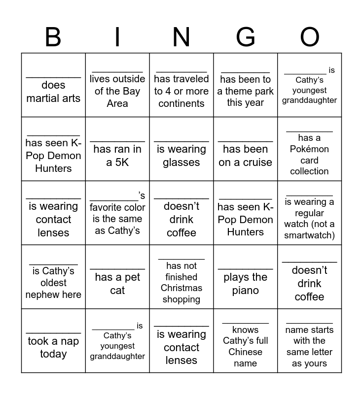 This bingo card has 75 words: _________ can say "mingle bingo" 5 times fast, _________ is left-handed, _________ has traveled to 4 or more continents, _________ is Cathy’s longest friend, _________ has birthday in the same month as Cathy, _________ is an ivy-league graduate, _________ traveled the farthest to get here, _________ can solve a Rubik’s Cube, _________ has a pet cat, _________ has a sister, _________ name starts with the same letter as yours, _________ is wearing red, _________ is wearing glasses, _________ has seen K-Pop Demon Hunters, _________ has been to Hawaii more than 5 times, _________’s favorite color is the same as Cathy’s, _________ plays a band instrument, _________ doesn’t drink coffee, _________ is Cathy’s oldest nephew here, _________ is Cathy’s youngest granddaughter, _________ drives a white car, _________ is wearing contact lenses, _________ has ran in a 5K, _________ lives outside of the Bay Area, _________ has been to a theme park this year, _________ is wearing braces, _________ supported a charity this month, _________ lives outside of the Bay Area, _________ has been to a theme park this year, _________ is wearing braces, _________ supported a charity this month, _________ has taught in a classroom, _________ enjoys gardening, _________ plays the piano, _________ has a Pokémon card collection, _________ has been on a cruise, _________ likes to sing karaoke, _________ is fluent in 3 or more languages, _________ is wearing a regular watch (not a smartwatch), _________ knows Cathy’s full Chinese name, _________ is wearing earrings, _________ enjoys watching crime dramas, _________ has a summer birthday, _________ plays golf, _________ likes to draw, _________ is the youngest sibling in their family, _________ took a nap today, _________ does martial arts, _________ was born in another country, _________ knows what “skibidi” means, _________ does not have a smartphone, _________ has not finished Christmas shopping, _________ plays pickleball, _________ is left-handed, _________ has traveled to more than 6 continents, _________ is Cathy’s longest friend, _________ has birthday in the same month as Cathy, _________ is an ivy-league graduate, _________ traveled the farthest to get here, _________ can solve a Rubik’s Cube, _________ has a pet cat, _________ has a sister, _________ name starts with the same letter as yours, _________ is wearing red, _________ is wearing glasses, _________ has seen K-Pop Demon Hunters, _________ has been to Hawaii more than 5 times, _________’s favorite color is the same as Cathy’s, _________ plays a band instrument, _________ doesn’t drink coffee, _________ is Cathy’s oldest nephew here, _________ is Cathy’s youngest granddaughter, _________ drives a white car, _________ is wearing contact lenses and _________ has ran in a 5K.