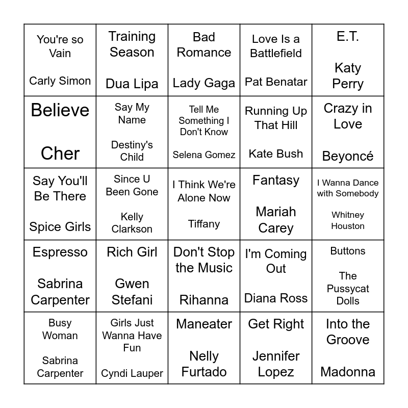 This bingo card has 40 words: Baby One More Time Britney Spears, Say You'll Be There Spice Girls, Hot Stuff Donna Summer, Say My Name Destiny's Child, Girls Just Wanna Have Fun Cyndi Lauper, Don't Stop the Music Rihanna, Tell Me Something I Don't Know Selena Gomez, Can't Get You Out of My Head Kylie Mingoue, E.T. Katy Perry, Espresso Sabrina Carpenter, Since U Been Gone Kelly Clarkson, Love Is a Battlefield Pat Benatar, I Think We're Alone Now Tiffany, I Wanna Dance with Somebody Whitney Houston, Fantasy Mariah Carey, Rich Girl Gwen Stefani, Holiday Madonna, You're so Vain Carly Simon, Genie in a Bottle Christina Aguilera, Bad Romance Lady Gaga, Buttons The Pussycat Dolls, Get Right Jennifer Lopez, Running Up That Hill Kate Bush, Believe Cher, Man! I Feel Like a Woman Shania Twain, (You Drive Me) Crazy Britney Spears, G.U.Y. Lady Gaga, Saturday Night Divas Spice Girls, Into the Groove Madonna, Walking on Broken Glass Annie Lennox, Confident Demi Lovato, Busy Woman Sabrina Carpenter, HOT TO GO! Chappell Roan, I'm Coming Out Diana Ross, Crazy in Love Beyoncé, Maneater Nelly Furtado, TikTok Kesha, Greedy Ariana Grande, Training Season Dua Lipa and Come On Over (All I Want is You) Christina Aguilera.