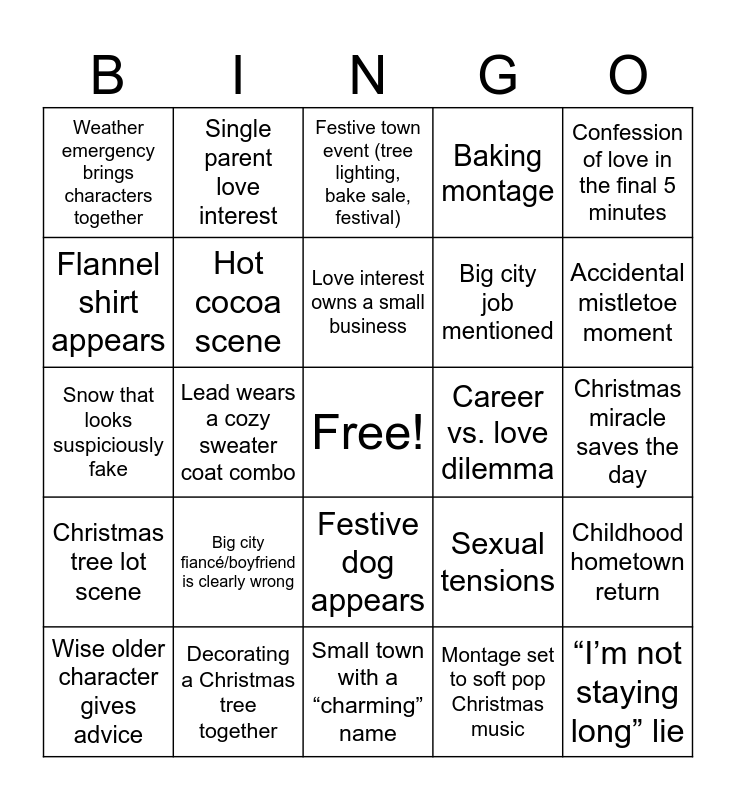 This bingo card has a free space and 27 words: Sexual tensions, Kid causes drama, Big city job mentioned, Small town with a “charming” name, Flannel shirt appears, Festive town event (tree lighting, bake sale, festival), Single parent love interest, Christmas tree lot scene, Career vs. love dilemma, Childhood hometown return, Snow that looks suspiciously fake, Baking montage, Wise older character gives advice, Decorating a Christmas tree together, Accidental mistletoe moment, Minor misunderstanding causes tension, Hot cocoa scene, Love interest owns a small business, Big city fiancé/boyfriend is clearly wrong, Weather emergency brings characters together, Christmas miracle saves the day, Montage set to soft pop Christmas music, Lead wears a cozy sweater coat combo, “I’m not staying long” lie, Festive dog appears, Confession of love in the final 5 minutes and Happy ending kiss as snow falls.