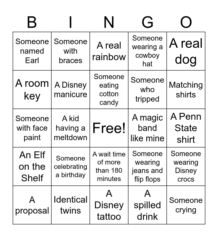 This bingo card has a free space and 29 words: A proposal, Make A Wish family, A kid having a meltdown, Someone paying with cash, Someone named Earl, A real rainbow, A Disney manicure, Someone celebrating a birthday, A magic band like mine, Identical twins, A Penn State shirt, Someone crying, A Disney tattoo, A spilled drink, Matching shirts, An angry parent, A wait time of more than 180 minutes, An Elf on the Shelf, A real dog, Someone with face paint, Someone wearing jeans and flip flops, A minion, Someone who tripped, A room key, Someone wearing a cowboy hat, Someone with braces, Someone wearing Disney crocs, Someone eating cotton candy and Disney earrings.