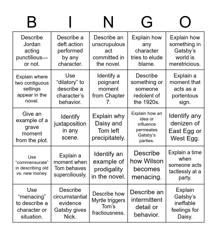 This bingo card has 25 words: Explain a moment when Tom behaves superciliously., Describe how Myrtle triggers Tom’s fractiousness., Identify a poignant moment from Chapter 7., Use “menacing” to describe a character or situation., Explain how something in Gatsby’s world is meretricious., Describe Jordan acting punctilious—or not., Explain where two contiguous settings appear in the novel., Describe a deft action performed by any character., Explain how an idea or influence permeates Gatsby’s parties., Identify an example of prodigality in the novel., Describe something or someone redolent of the 1920s., Give an example of a grave moment from the plot., Describe how Wilson becomes menacing., Explain a time when someone acts tactlessly at a party., Use “dilatory” to describe a character’s behavior., Explain Gatsby’s ineffable feelings for Daisy., Identify any denizen of East Egg or West Egg., Describe an unscrupulous act committed in the novel., Explain a moment that acts as a portentous sign., Identify juxtaposition in any scene., Explain why Daisy and Tom left precipitately., Describe circumstantial evidence Gatsby gives Nick., Use “commensurate” in describing old vs. new money., Explain how any character tries to elude blame. and Describe an intermittent detail or behavior..